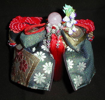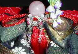 帯にも 蝶をつけてあります 天然石(ローズクオーツ)大玉を 帯飾りに使用
