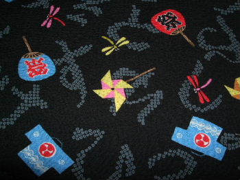 1 黒地 風車・うちわ・ハッピ柄 あと一枚の見込み 2 紺地 かえる柄 小さい子であと一枚の見込み