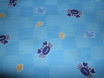 3 茶色 風車・トンボ柄 小さい子であと一枚の見込み 4 水色地 かにとヤドカリ柄 小さい子であと一枚の見込み