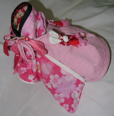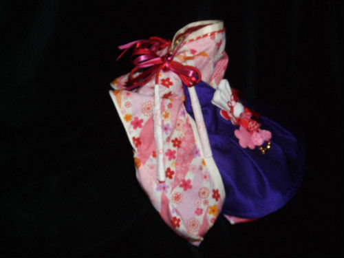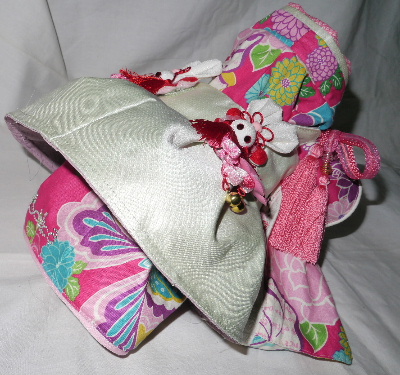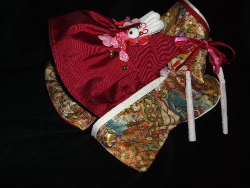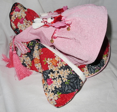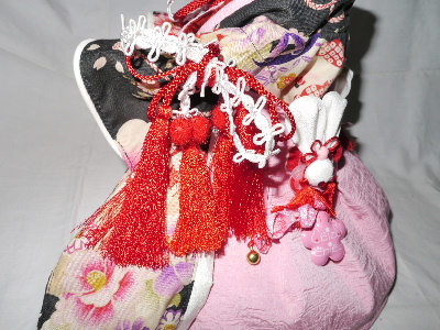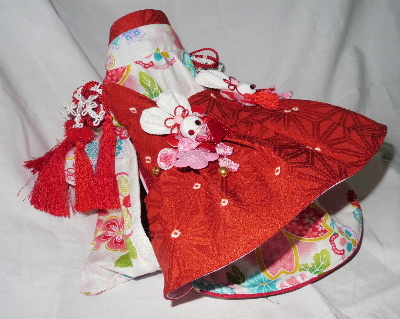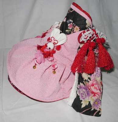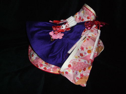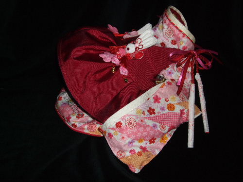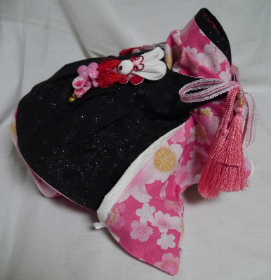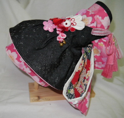 NO.5 古典柄 お被布セット 完売しました 2.4〜2.8kg位(チワワちゃん等 普通体形のわんちゃん用) お着物 : 黒&赤地・古典柄(化繊) × ピンク地・桜柄(綿) お被布 : 黒地 ラメ銀通し(正絹) × ピンク地 地模様(化繊)