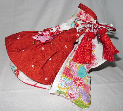 NO.2 お被布セット 完売しました 2.0〜2.3kg位(チワワちゃん等 普通体形のわんちゃん用) お着物 : ベージュ地・古典柄 × 白地・小花柄 お被布 : 赤地 × 濃紺(深い紫にも見えます) お着物・お被布 共にリバーシブル 4通りの着せ方が可能です 2013.2.24 UP