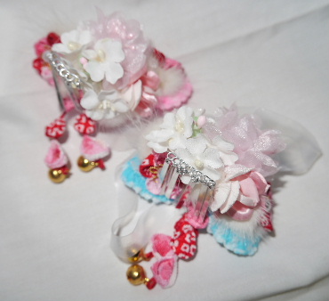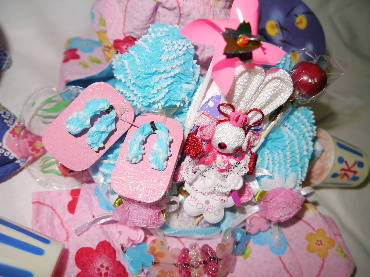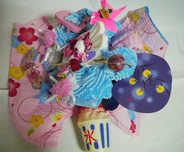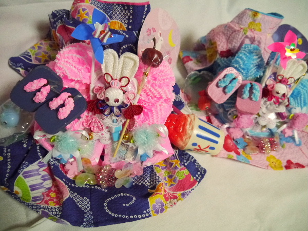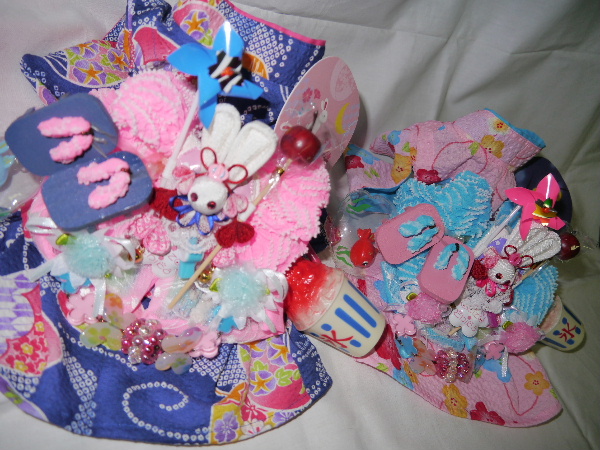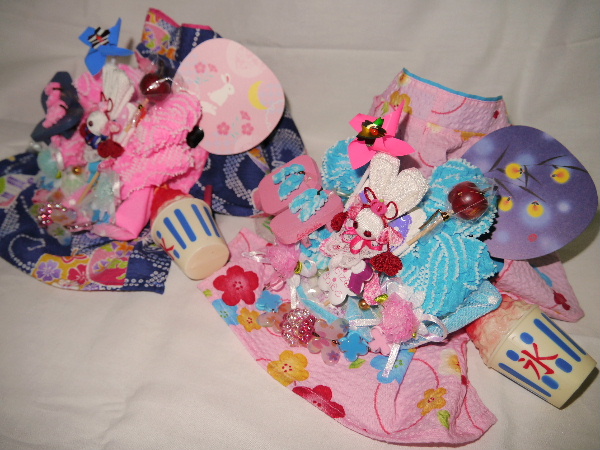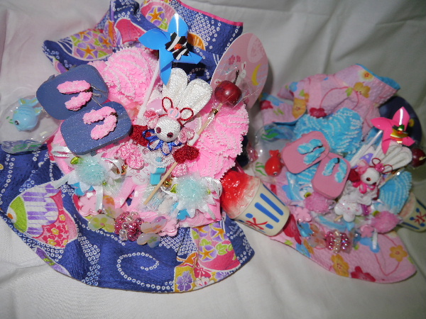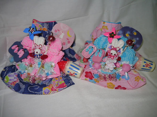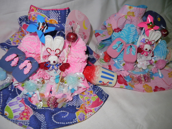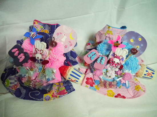 2013 ゆ か た セ ッ ト お客様にお届けした作品です 2セット、色目をおそろいの雰囲気で作ってみました ゆかた用小物(巾着・髪飾り・下駄)も フルセットでご注文下さいました |
