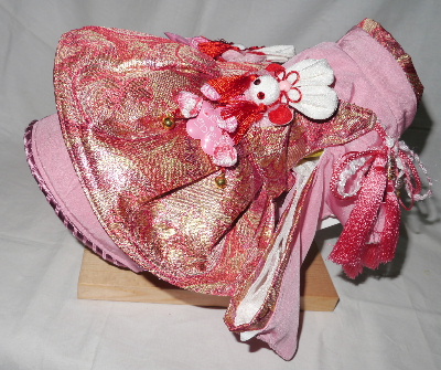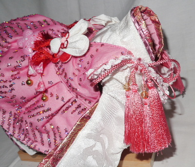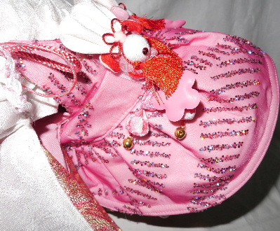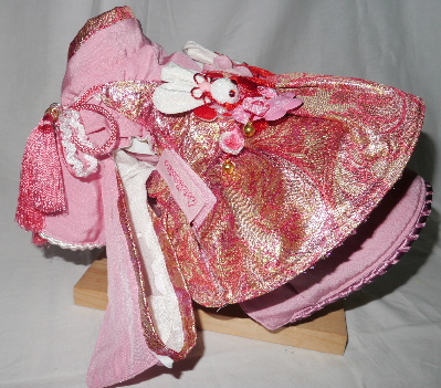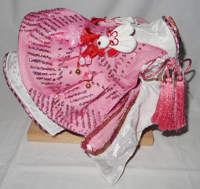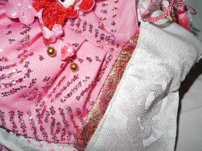 お着物・・・白 バラ柄(正絹) × ピンク 無地(化繊) お被布・・・ピンク ラメ生地 × 金襴帯地