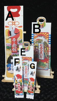 A 千歳飴(特大)・・・・・・・・・・約54cm B 七五三まいり (大)・・・・・・約40cm C 千歳飴(大)・・・・・・・・・・・・約36cm D ペコポコ千歳飴(大)・・・・・約36cm E 七五三まいり (小)・・・・・・約30cm F 千歳飴 持ち手ウサギ付・・・・・・・・約28cm G 千歳飴 持ち手ウサギ付・・・・・・・・約25cm H (特小)・・・・・・・・・・・・・・・・約5.5cm (主に帯や被布に付けるためのもの)