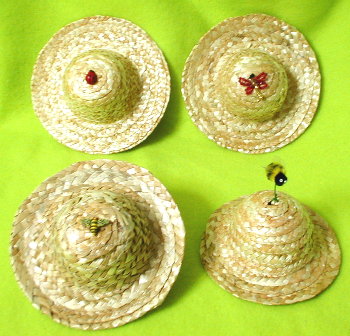 麦わら帽子は 左上 てんとう虫(リアルです) 右上トンボ(素材 ビーズ) 左下 はち(リアルです) 右下 はち(素材 モール) が それぞれ 頭のてっぺんに 付いております (お任せになりますご了承下さい) |